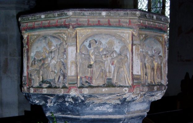 Leaving the village itself I went in search of the church, a mile away, through winding lanes and down a steep and muddy Church Hill. And, there is St Andrew’s Church, on a bit of a mound, surrounded by snowdrops and winter aconites and ancient trees, secretive and other-worldly in the winter sunlight. An early Norman church, with the tower to the west built several hundred years later; and then a new nave to the north, its chancel a hundred years after that whilst the old church became a south aisle. Standing in the space beneath the tower looking back, the richly decorated doorway would have been the main entrance to the Romanesque church. The church has an abundance of historical treasures to feast one’s eyes upon; not least, a seven sacrament font, the painted rood screen, wall paintings, scratch marks and roof angels.